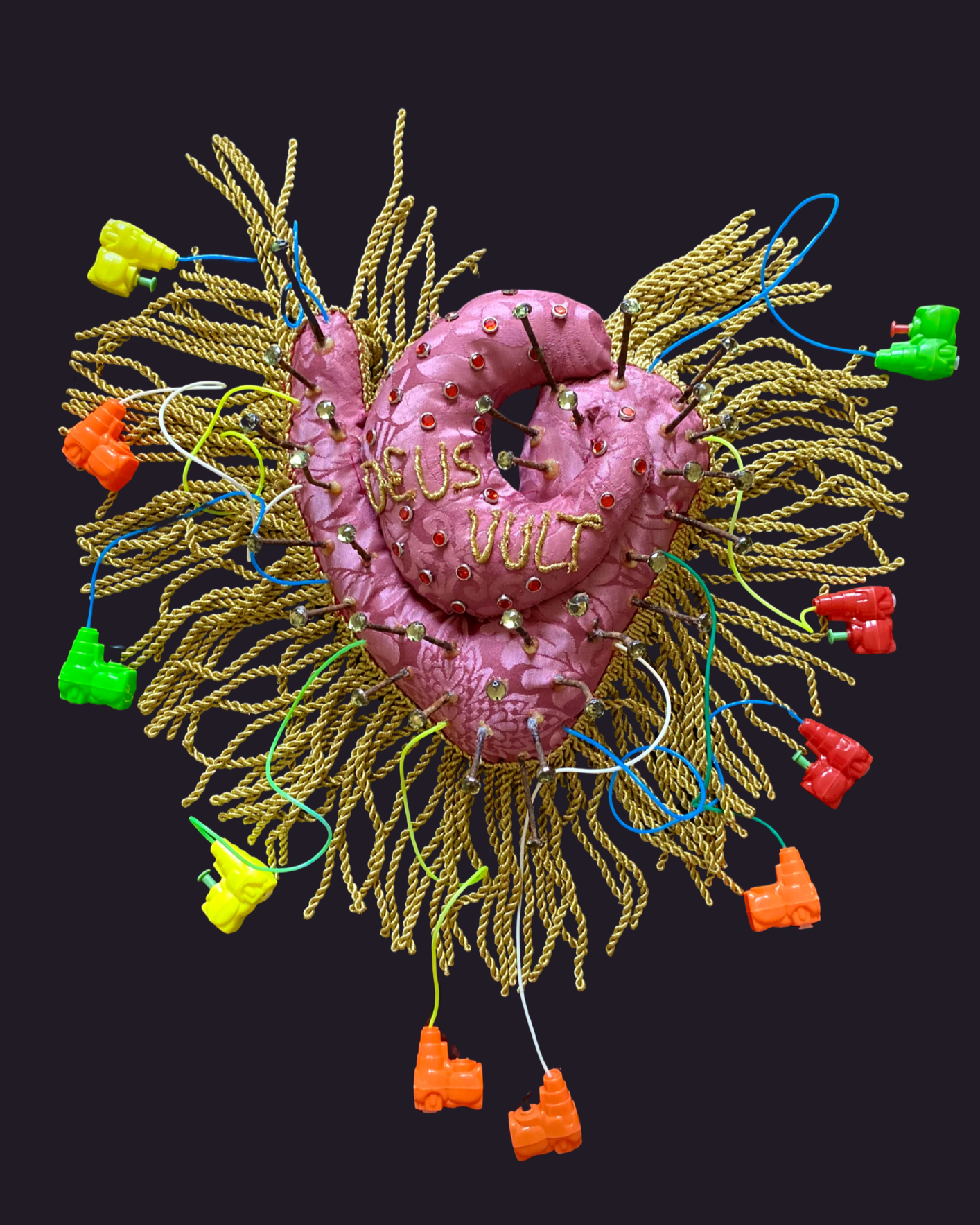 A heart-shaped form in floral damask brocade, pierced by rusted rhinestone-headed nails and surrounded by toy water guns. The words — God wills it — are embroidered directly onto the surface.
