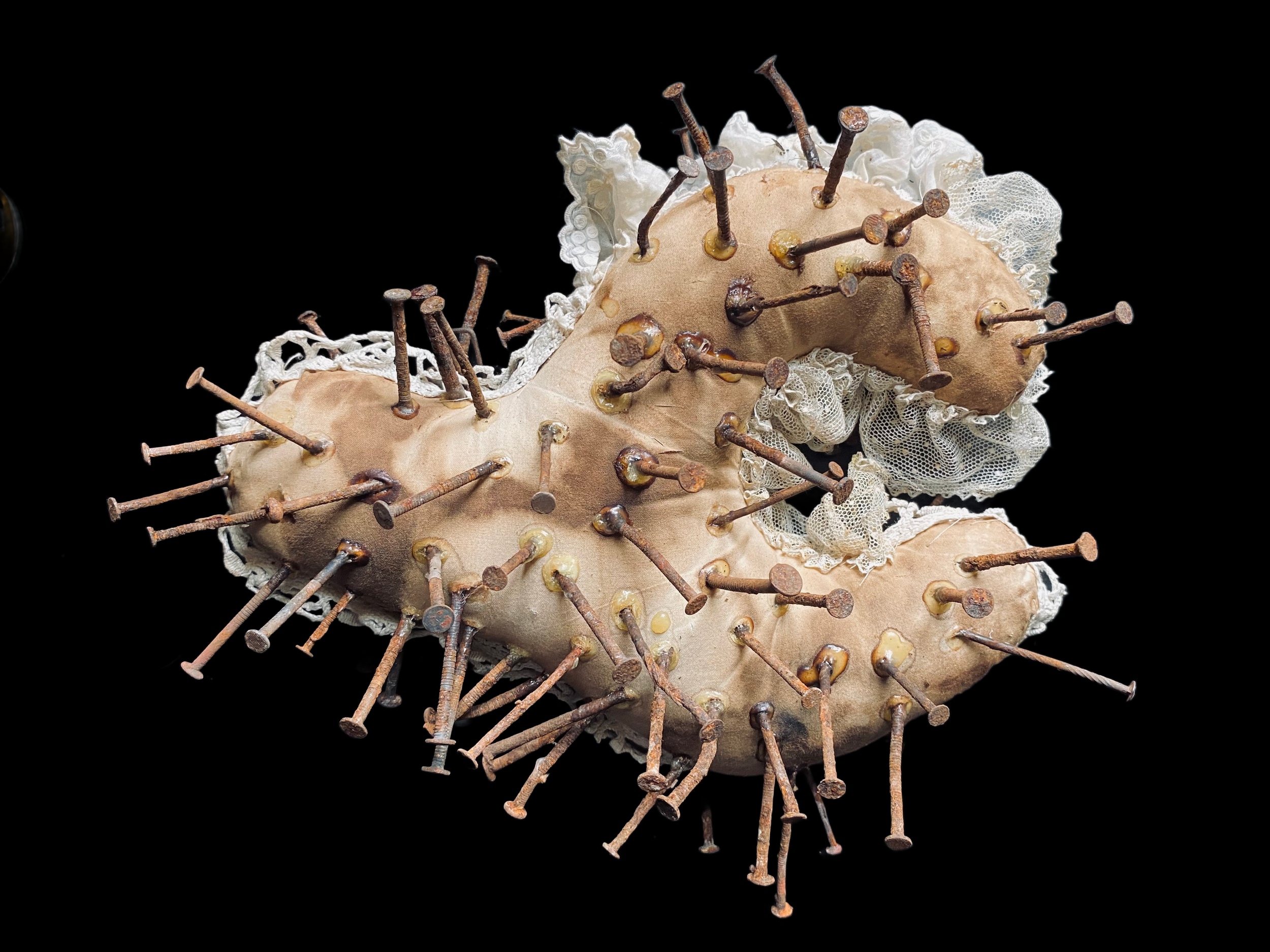 An exploration of trauma through material. A soft toy the embodiment of comfort and safety —pierced by nails, reimagines them not just as tools of violence, but as co-actors in histories of suffering and redemption. Inspired by the crucifixion, this work raises the questions : what if matter remembers pain? What if healing isn’t soft? It proposes dismantling binaries—object/subject, passive/active, harm/healing. It is not about trauma; it is a material negotiation with trauma, in which the cuddly toy and the nail each have agency, affect, and force.